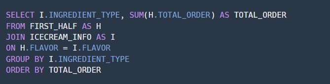 ★ 주성분 별로 총 판매량을 구해야 하기 때문에 SUM(H.TOTAL_ORDER)로 금액 합을 구해줌