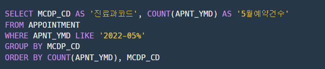 EX) GROUP BY '진료과코드' ORDER BY '5월예약건수', '진료과코드' => X