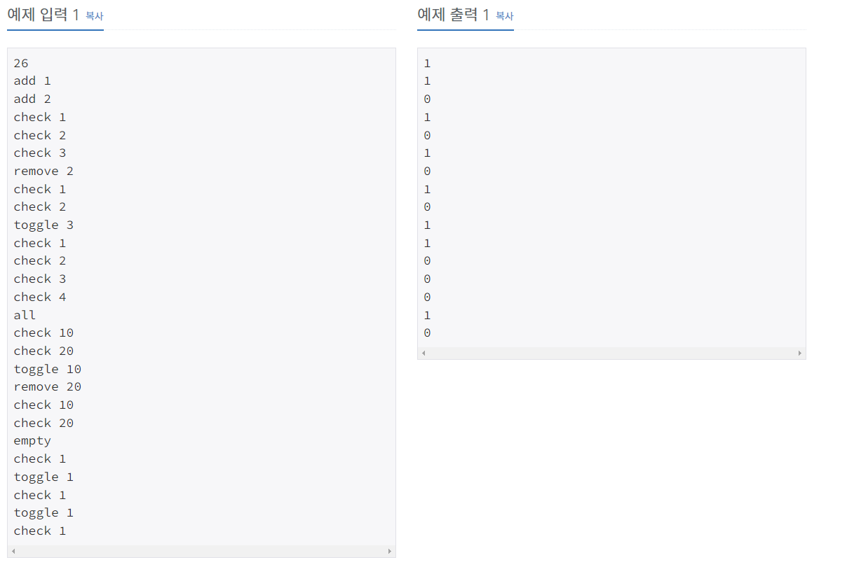 - check x: S에 x가 있으면 1을, 없으면 0을 출력한다. (1 ≤ x ≤ 20)