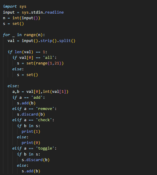 - toggle x: S에 x가 있으면 x를 제거하고, 없으면 x를 추가한다. (1 ≤ x ≤ 20)
