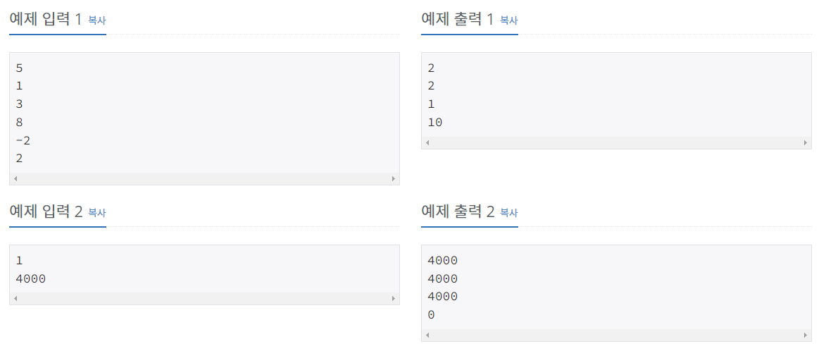 N개의 수가 주어졌을 때, 네 가지 기본 통계값을 구하는 프로그램을 작성하시오.