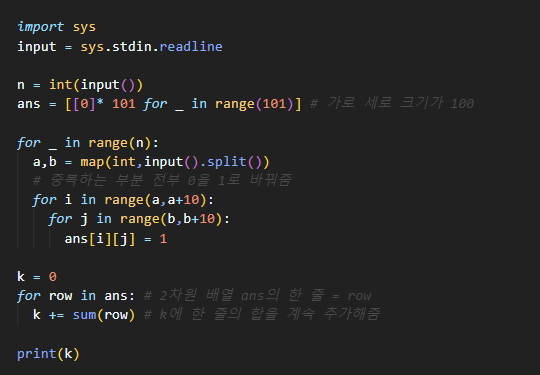 가로, 세로의 크기가 각각 100인 정사각형 모양의 흰색 도화지가 있다. 이 도화지 위에 가로, 세로의 크기가 각각 10인 정사각형 모양의 검은색 색종이를 색종이의 변과 도화지의 변이 평행하도록 붙인다. 이러한 방식으로 색종이를 한 장 또는 여러 장 붙인 후 색종이가 붙은 검은 영역의 넓이를 구하는 프로그램을 작성하시오.