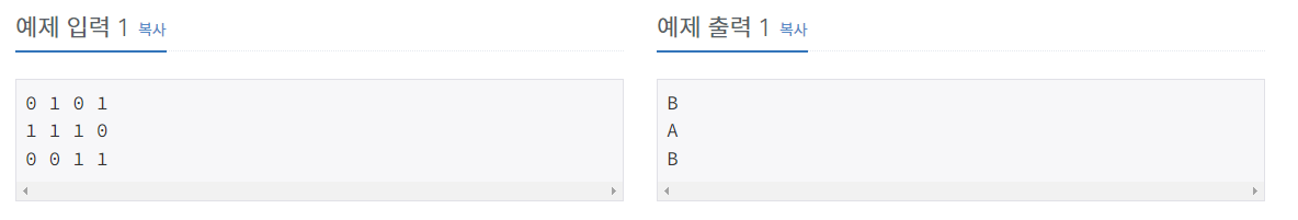 첫째 줄부터 셋째 줄까지 한 줄에 하나씩 결과를 도는 A, 개는 B, 걸은 C, 윷은 D, 모는 E로 출력한다.