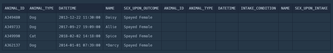★ 이렇게 출력을 하였을 때, 다음과 같이 특정 동물에게는 ANIMAL_INS에 대한 정보가 없음을 확인할 수 있습니다.