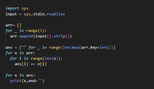 칠판에 붙여진 단어들이 주어질 때, 영석이가 세로로 읽은 순서대로 글자들을 출력하는 프로그램을 작성하시오.