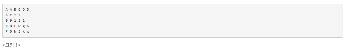 이 장난감에 있는 글자들은 영어 대문자 ‘A’부터 ‘Z’, 영어 소문자 ‘a’부터 ‘z’, 숫자 ‘0’부터 ‘9’이다. 영석이는 칠판에 글자들을 수평으로 일렬로 붙여서 단어를 만든다. 다시 그 아래쪽에 글자들을 붙여서 또 다른 단어를 만든다. 이런 식으로 다섯 개의 단어를 만든다. 아래 그림 1은 영석이가 칠판에 붙여 만든 단어들의 예이다