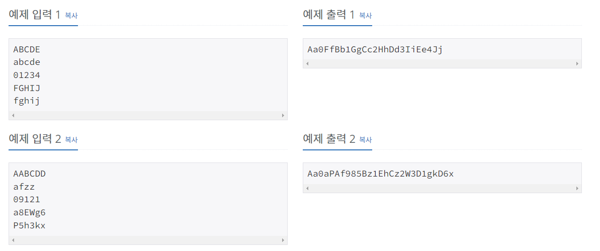 총 다섯줄의 입력이 주어진다. 각 줄에는 최소 1개, 최대 15개의 글자들이 빈칸 없이 연속으로 주어진다. 주어지는 글자는 영어 대문자 ‘A’부터 ‘Z’, 영어 소문자 ‘a’부터 ‘z’, 숫자 ‘0’