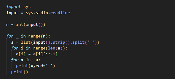 각 테스트 케이스에 대해서, 입력으로 주어진 문장의 단어를 모두 뒤집어 출력한다.