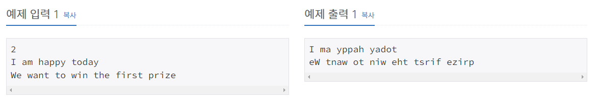 첫째 줄에 테스트 케이스의 개수 T가 주어진다. 각 테스트 케이스는 한 줄로 이루어져 있으며, 문장이 하나 주어진다. 단어의 길이는 최대 20, 문장의 길이는 최대 1000이다. 단어와 단어 사이에는 공백이 하나 있다.