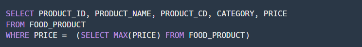 ★ MAX함수를 사용하여 최댓값을 구할 때 해당 컬럼의 최댓값만 찾고 싶을 때는 SELECT문에서 MAX(칼럼명)을 통해 바로 찾아주면 됩니다. 하지만 최댓값의 다른 칼럼까지 함께 출력하고 싶다면 서브쿼리를 사용하여 MAX문을 작성하는 것이 필요합니다.