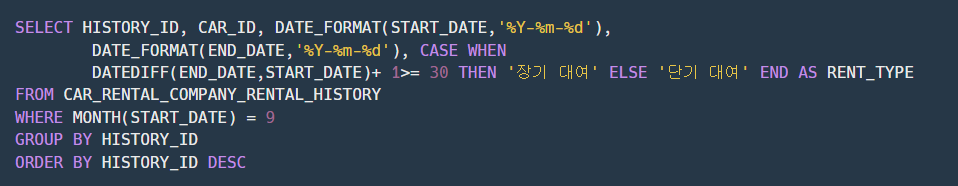 ★ WHERE절에서 시작 월이 9월인 데이터만 추출한 뒤 GROUP BY절에서 대여 기록 ID를 기준으로 그룹핑을 해줍니다.