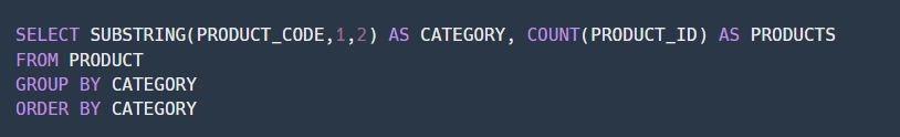★ SUBSTRING() 함수를 사용해 PRODUCT_CODE의 첫번째 문자부터 2개의 문자를 골라 추출해줍니다.