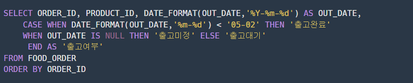 ★ 위와 같은 과정을 거칠 때, DATE_FORMAT 구문으로 출고날짜을 포맷팅할 때 05-02라는 날짜를 문자열이 아닌 숫자형으로 쓰면 출력 값이 제대로 나오지 않습니다. 그렇기 때문에 꼭 문자열 형태로 써주셔야 합니다 !
