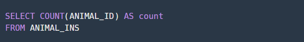 ★ 동물에 따라 부여되는 ID가 다르기 때문에 집계함수 COUNT를 사용하여 ANIMAL_ID의 갯수를 구한 뒤, count라는 칼럼명으로 출력합니다 !