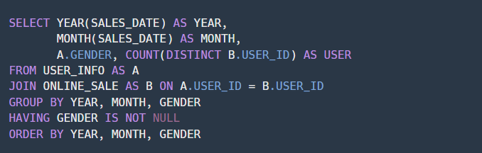 ★ 또한 GROUP BY를 사용하여 정렬을 하는 과정에서 년, 월, 성별 별로 정렬을 하라고 했기 때문에 YEAR, MONTH, GENDER 순으로 정렬을 진행합니다.