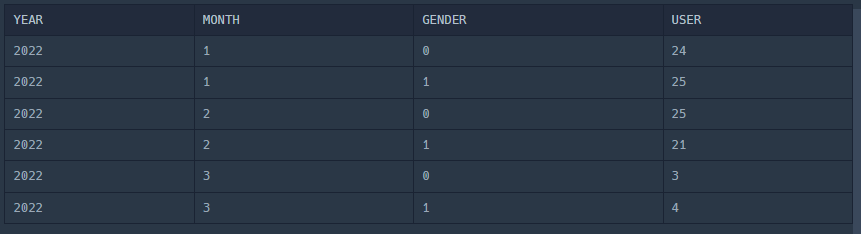 ★ 문제의 포인트는 회원수를 구하는 과정에서 중복을 제거해줘야 하는 부분입니다 ! 'DISTINCT'라는 키워드를 사용하여 중복을 제거해주지 않는다면, USER_ID가 1인 사람이 해당 년, 월에 구입을 2번 했을 경우, 회원수에는 +2가 되기 때문입니다 ! 그래서 다음과 같은 결과를 출력하게 됩니다.