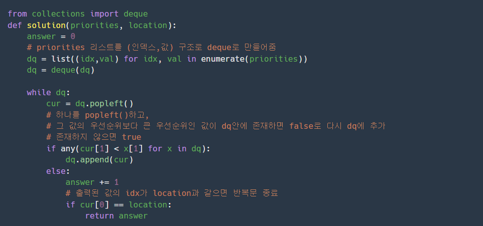 ★ 반복문을 진행하면서 pop된 값들은 큐 중 가장 우선순위가 큰 값입니다. 저희는 location과 같은 인덱스 값을 가지고 있는 cur이 몇 번째로 출력되는지 확인해줘야 합니다. 그렇기에 while문을 돌면서 큐에서 pop이 될 때마다 answer를 하나씩 올려주고, 출력된 값의 인덱스 번호가 location과 같으면 answer를 return 해줘서 while문을 종료합니다 !