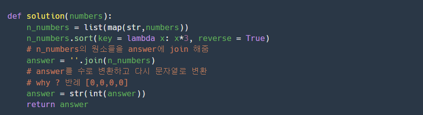 ★ 정렬하는 과정에서 lambda 함수를 사용하는데 x*3을 해주는 이유는 numbers의 원소가 1이상 1000이하이기 때문에 최대 3자릿수까지 비교할 수 있기 때문입니다.