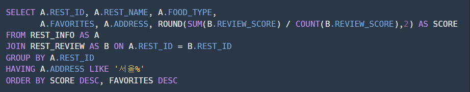 ★ GROUP BY절에서 REST_ID를 기준으로 그룹핑을 진행한 뒤, HAVING에서 주소가 '서울'인 데이터들만 추출합니다.