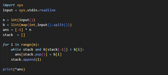 ★ 정답을 출력하기 위한 배열 ans는 -1로 초기화합니다. 그 이유는 해당 수의 오큰수가 없을 경우 -1이 출력되어야 하기 때문입니다.