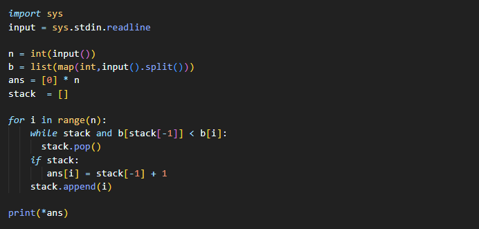 ★ 이전에 풀이했던 오큰수 문제와 비슷한 유형의 문제입니다. 레이저를 수신하는 탑이 없다면, 0이 출력되어야 하기 때문에 ans를 0으로 초기화합니다.