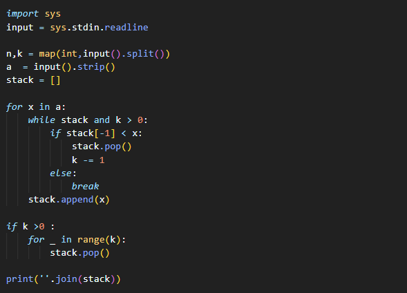 ★ for문을 돌면서 stack이 비어있지 않고, 제거해야 하는 갯수인 k가 0보다 크다면 stack의 최상단 값과 반복문을 도는 값의 크기 비교를 해줍니다. 만약 stack안에 있는 값이 작다면 pop으로 제거해주고, k또한 -1 해줍니다. 크다면 while문을 빠져나간 뒤 stack에 해당 값을 append 해줍니다.