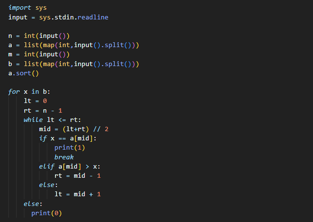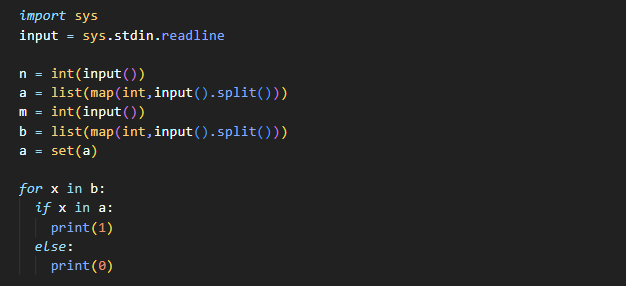 ★ 이번 문제는 자료형을 사용하거나 이분탐색을 사용하는 방식으로 해결할 수 있는 문제입니다. 먼저 자료형 set을 사용하면 입력받은 a리스트에서 중복된 수가 제거되고 값들을 정렬한 형태로 반환합니다. b 리스트를 돌면서 in을 활용하여, 해당 수가 a에 들어있다면 1을, 없다면 0을 출력합니다.