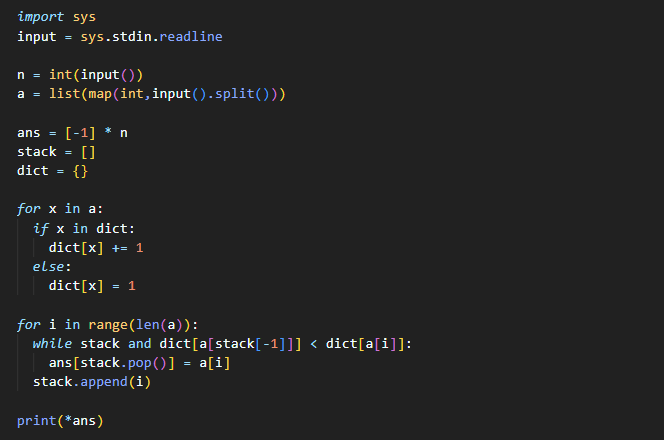 ★ 입력받은 배열을 읽으면서 stack의 최상단의 값이 딕셔너리 안에 가지고 있는 수가 해당 값의 수보다 작을 때 stack안의 수는 pop되고, 반복문을 돌던 수가 stack의 최상단 수의 오등큰수이기 때문에 그 수를 정답을 출력하는 리스트인 ans에 저장해줍니다 !