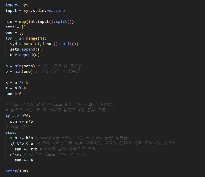 ★ 문제를 해결하는 과정에서 몇가지 경우를 생각해줘야 합니다. 먼저 입력받은 세트와 낱개의 가격을 각각 리스트에 추가하고 해당 리스트의 최솟값을 변수로 설정해줍니다.