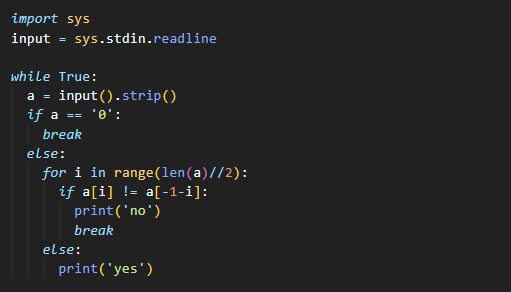 ★ 만약 일치하지 않으면 no를 출력한 뒤 break 해주고, 반복문이 break이 없이 정상적으로 끝난 경우 그 수는 팰린드롬 수이기 때문에 yes를 출력해줍니다 :)