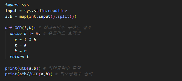 ★ 최대공약수는 유클리드 호제법을 통해 구해주고, 최소공배수는 두 자연수의 곱을 최대공약수로 나눠서 구해줍니다 !