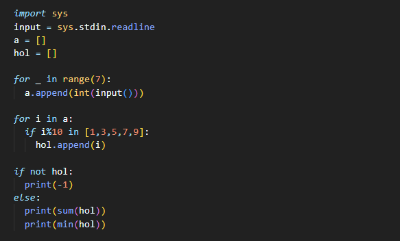★ 만약 hol 리스트가 비어있다면 홀수가 없는 것이기에 -1을 출력하고, 값이 있을 경우 sum함수와 min함수를 사용하여 합과 최솟값을 출력해줍니다 !