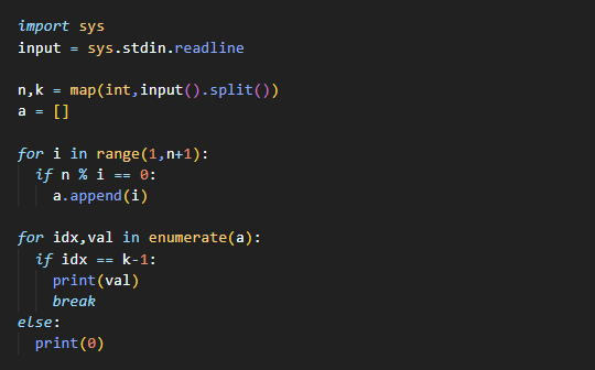 ★만약 k번째 약수가 없으면 0을 출력해야 하기 때문에 for문을 돌면서 break문에 걸리지 않고 반복문을 빠져나온다면 약수가 없는 것이기에 0을 출력해줍니다 :)