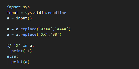 ★ 이때, 갱신한 문자열 a에 'X'가 들어있다면 덮을 수 없는 보드판이기 때문에 -1을 출력하고, 아닐 시 보드판을 그대로 출력해줍니다.