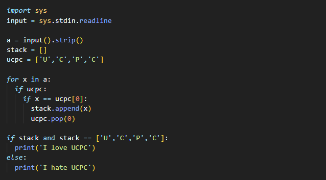 ★ 비교 과정이 끝났을 때 stack이 비어있지 않고, 그 안의 값들이 UCPC와 같으면 'I love UCPC'를, 아니라면 'I hate UCPC'를 출력해줍니다 :)