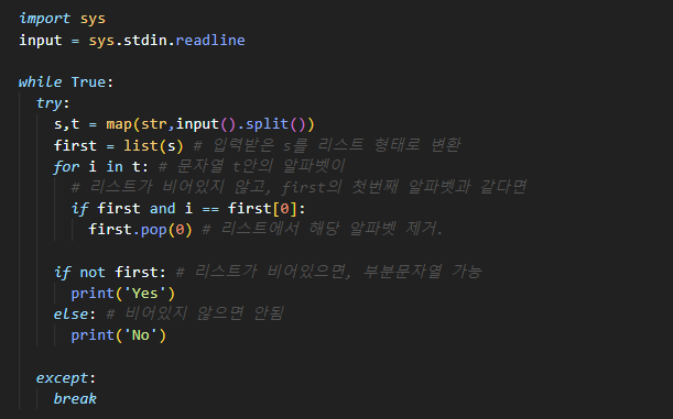 입력은 여러 개의 테스트 케이스로 이루어져 있다. 각 테스트 케이스는 한 줄로 이루어져 있으며, 문자열 s 와 t가 빈칸을 사이에 두고 들어온다. s와 t의 길이는 10만을 넘지 않는다.