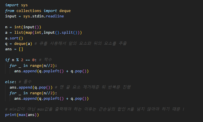 ★ 입력받은 요소들을 오름차순으로 정렬해줍니다. 이 때, 근손실을 최소로 하기 위해서는 근손실이 가장 적은 것과 가장 많은 것을 합해줘야 합니다 !