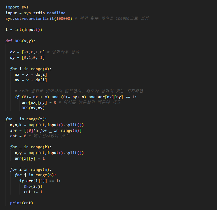 ★ 해당 좌표의 상하좌우를 탐색하면서 인접한 지역을 체크해줍니다. 체크를 해주면서 인접한 지역이 끝났을 경우 cnt를 1증가시켜 지렁이가 필요한 갯수를 카운트 해줍니다 :)