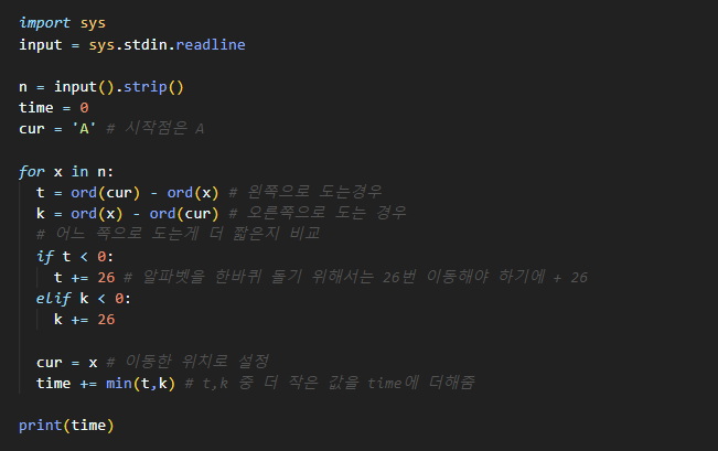 ★ 기준점으로부터 해당 알파벳까지 어느 방향으로 이동하는 게 더 짧은지 비교하기 위해선 ord() 함수를 사용하여 문자열을 아스키 코드로 바꾼 후 연산을 진행해야 합니다.