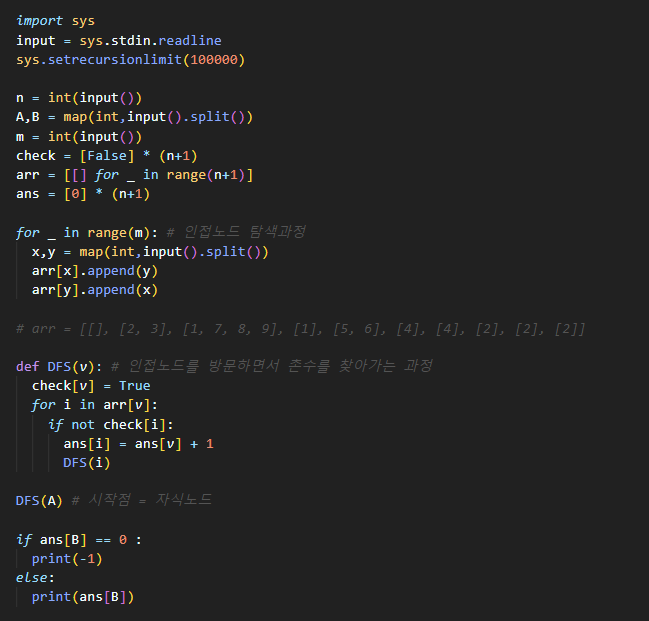 사람들은 1, 2, 3, …, n (1 ≤ n ≤ 100)의 연속된 번호로 각각 표시된다. 입력 파일의 첫째 줄에는 전체 사람의 수 n이 주어지고, 둘째 줄에는 촌수를 계산해야 하는 서로 다른 두 사람의 번호가 주어