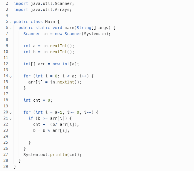 첫째 줄에 N과 K가 주어진다. (1 ≤ N ≤ 10, 1 ≤ K ≤ 100,000,000) 둘째 줄부터 N개의 줄에 동전의 가치 Ai가 오름차순으로 주어진다. (1 ≤ Ai ≤ 1,000,000, A1 = 1, i ≥ 2인 경우에 Ai는 Ai-1의 배수)