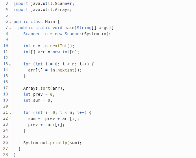 첫째 줄에 사람의 수 N(1 ≤ N ≤ 1,000)이 주어진다. 둘째 줄에는 각 사람이 돈을 인출하는데 걸리는 시간 Pi가 주어진다. (1 ≤ Pi ≤ 1,000)