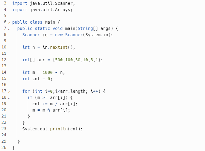 타로는 자주 JOI잡화점에서 물건을 산다. JOI잡화점에는 잔돈으로 500엔, 100엔, 50엔, 10엔, 5엔, 1엔이 충분히 있고, 언제나 거스름돈 개수가 가장 적게 잔돈을 준다. 타로가 JOI잡화점에서 물건을 사