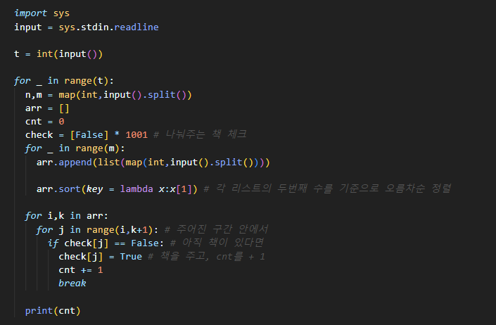 ★ 주어진 구간 i,k중 k를 기준으로 정렬하는 이유는 책을 최대한 많은 사람들에게 줘야 하며 범위가 더 크기 때문에 책을 가져갈 수 있는 범위 또한 넓기 때문입니다.