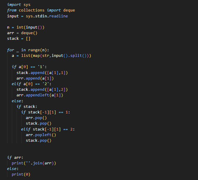★ 누르는 버튼에 따라 순서대로 들어오는 알파벳을 기록할 stack과 문자를 만드는 큐를 따로 만들어 풀이를 진행했습니다. 버튼 2의 경우에는 문자열의 앞에 알파벳을 추가해야 하고, 버튼 3을 눌렀을 경우 문자열의 앞에서 알파벳을 제거해야 하기 때문에 양방향 push, pop이 가능한 큐를 사용하였습니다.