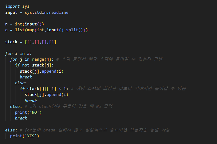 ★ 구현하는 과정에서 for ~ else 구문을 사용하였습니다. 만약 for문이 break에 걸리지 않고 정상적으로 종료된 경우 else문을 실행하게 되는데, 이중 for문 안에 else는 만약 해당 수가 스택 어디에서 들어갈 수 없다면 오름차순을 만들 수 없기에 'NO'를 출력하고 for문을 종료합니다. 첫 반복문의 else는 만약 반복문이 'NO'로 종료되지 않았다면 모든 수가 stack에 들어갔고, 이 수들을 오름차순 정렬할 수 있기에 'YES"를 출력합니다.