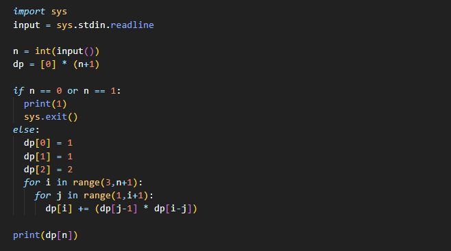 다음의 점화식에 의해 정의된 수열 t(n)을 생각하자: t(0)=1 t(n)=t(0)*t(n-1)+t(1)*t(n-2)+...+t(n-1)*t(0) 이 정의에 따르면, t(1)=t(0)*t(0)=1 t(2)=t(0)*t(1)+t(1)*t(0)=2 t(3)=t(0)*t(2)+t(1)*t(1)+t(2)*t(0)=5 ... 주어진 입력 0 ≤ n