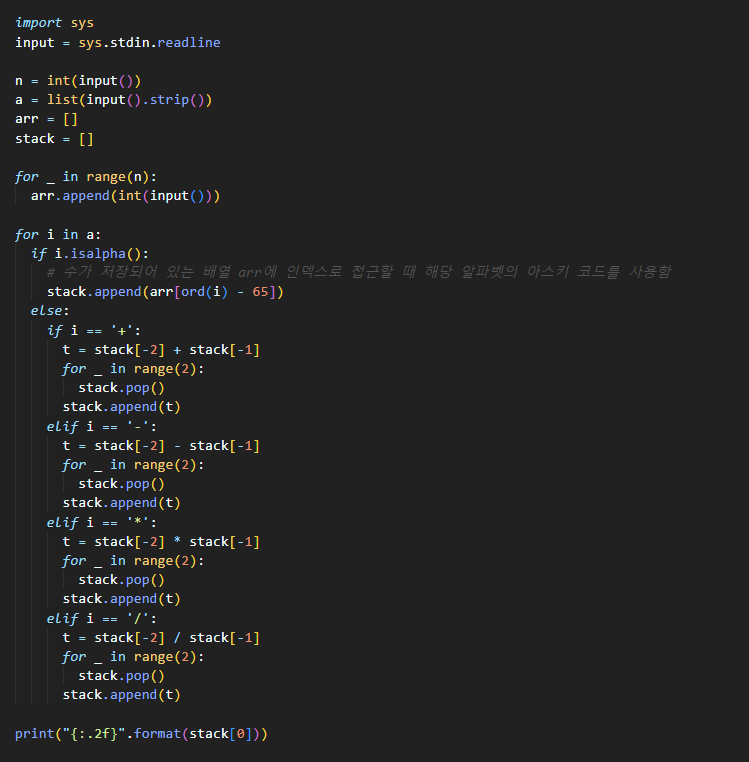 문제에서 알파벳 A부터 순서대로 n개의 문자는 n+2번째 줄부터 입력 받는 피연산자에 대응한다고 했습니다 ! 그렇기에 A는 배열 arr의 인덱스 0, B는 arr의 인덱스 1이 됩니다