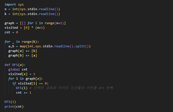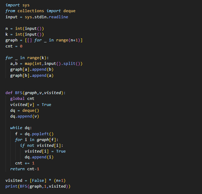 첫째 줄에는 컴퓨터의 수가 주어진다. 컴퓨터의 수는 100 이하인 양의 정수이고 각 컴퓨터에는 1번 부터 차례대로 번호가 매겨진다. 둘째 줄에는 네트워크 상에서 직접 연결되어 있는 컴퓨터 쌍
