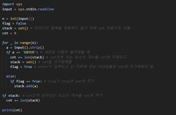 ★ 'ENTER'이 입력된 이후로는 들어오는 닉네임들을 set에 추가해줘야 합니다. (enter은 제외)